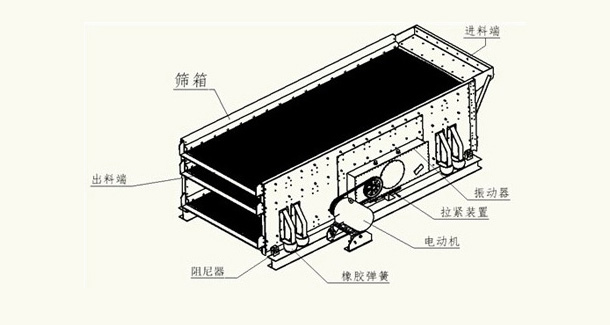 由電機、傳動裝置、激振器、篩箱、橡膠彈簧、底架、阻尼器等構成。