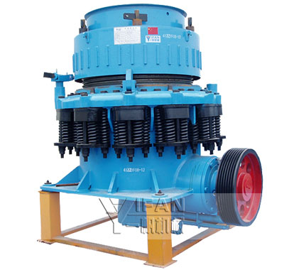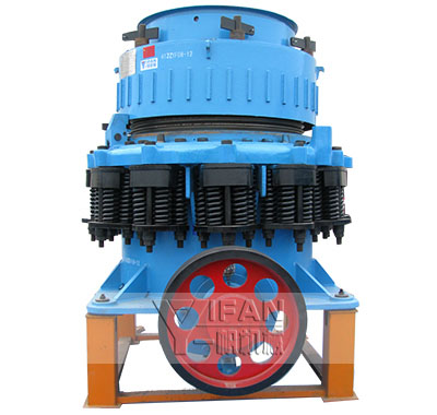 彈簧圓錐破碎機工作時,由電動機通過三角帶、大帶輪、傳動軸、小錐齒輪、大錐齒輪帶動偏心套旋轉,破碎圓錐軸心線在偏心軸套的迫動下做旋轉擺動,使得破碎壁表面時而靠近又時而離開軋臼壁的表面,從而使物料在定錐與動錐組成的環形破碎腔內不斷地受到沖擊、擠壓和彎曲而破碎。經過多次擠壓、沖擊和彎曲后,物料破碎至要求粒度,經下部排出。 廣泛應用于冶金、建筑、水電、交通、化工、建材工業中, 適合破碎堅硬、中等硬度以上的各種礦石和巖石。