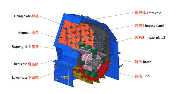 全篩分式篦條模塊化設(shè)計,更換方便快捷,同時篦條圓弧面增加破碎面積,具有透孔率高,粒型好,成品率及多邊形物料占比極高,石粉量低等特點。
