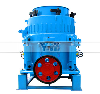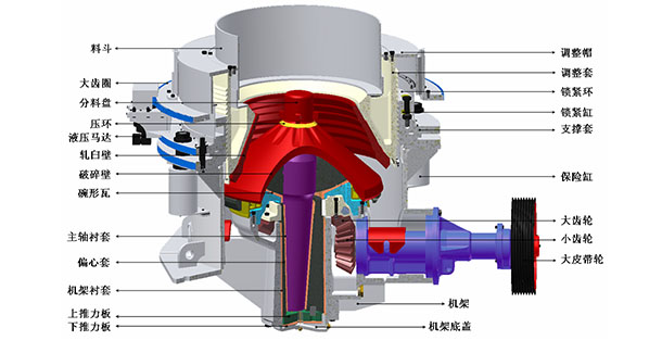 CCH系列液壓圓錐破碎機工作時,由電動機通過三角帶、主機帶輪、傳動軸、小錐齒輪、大錐齒輪帶動外銅旋轉,破碎圓錐軸心線在外銅的迫動下做旋轉擺動,使得破碎壁表面時而靠近又時而離開軋臼壁的表面,從而使物料在定錐與動錐組成的環形破碎腔內不斷地受到沖擊、擠壓和彎曲而破碎。經過多次擠壓、沖擊和彎曲后,物料破碎至要求粒度,經下部排出。